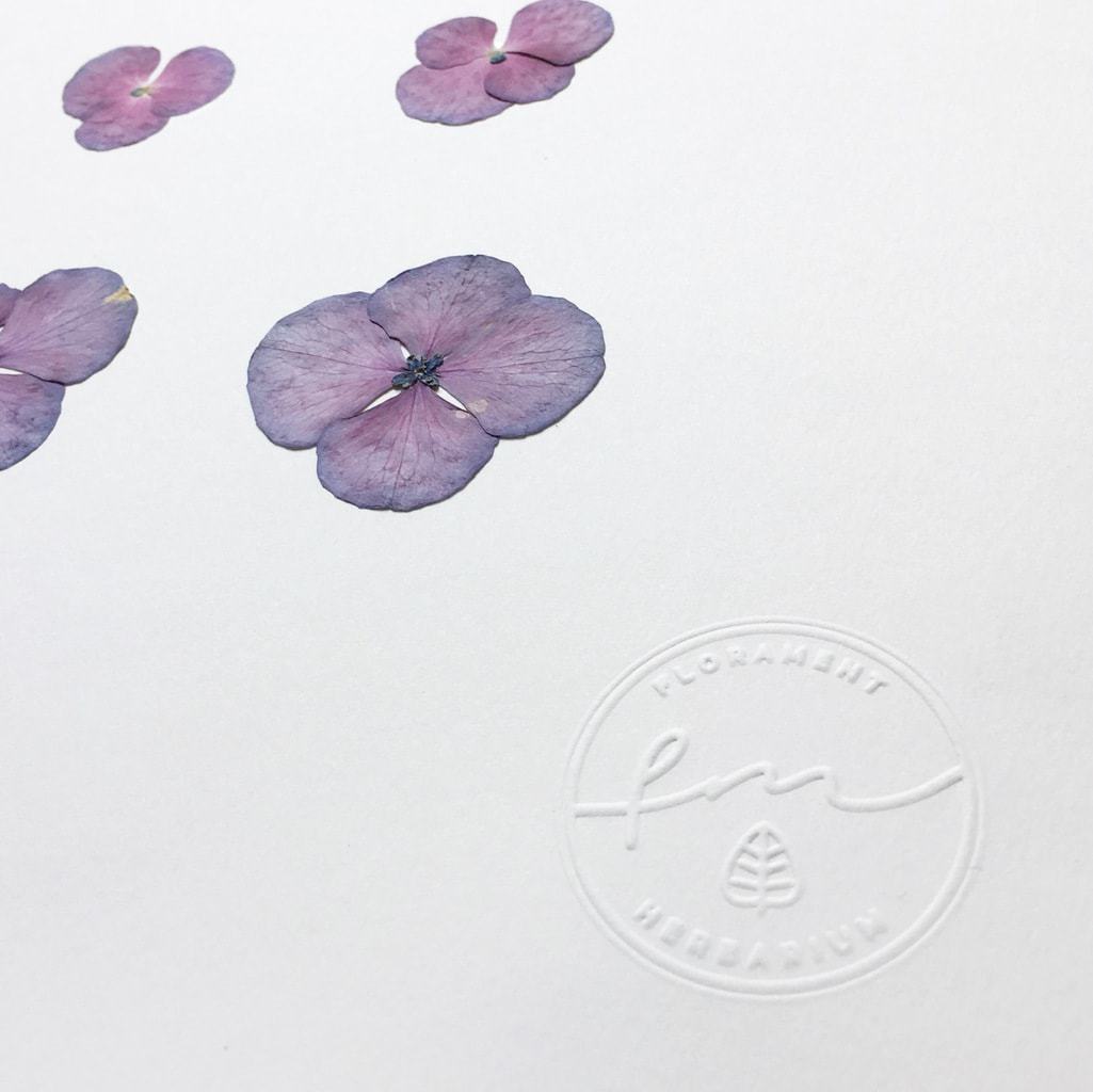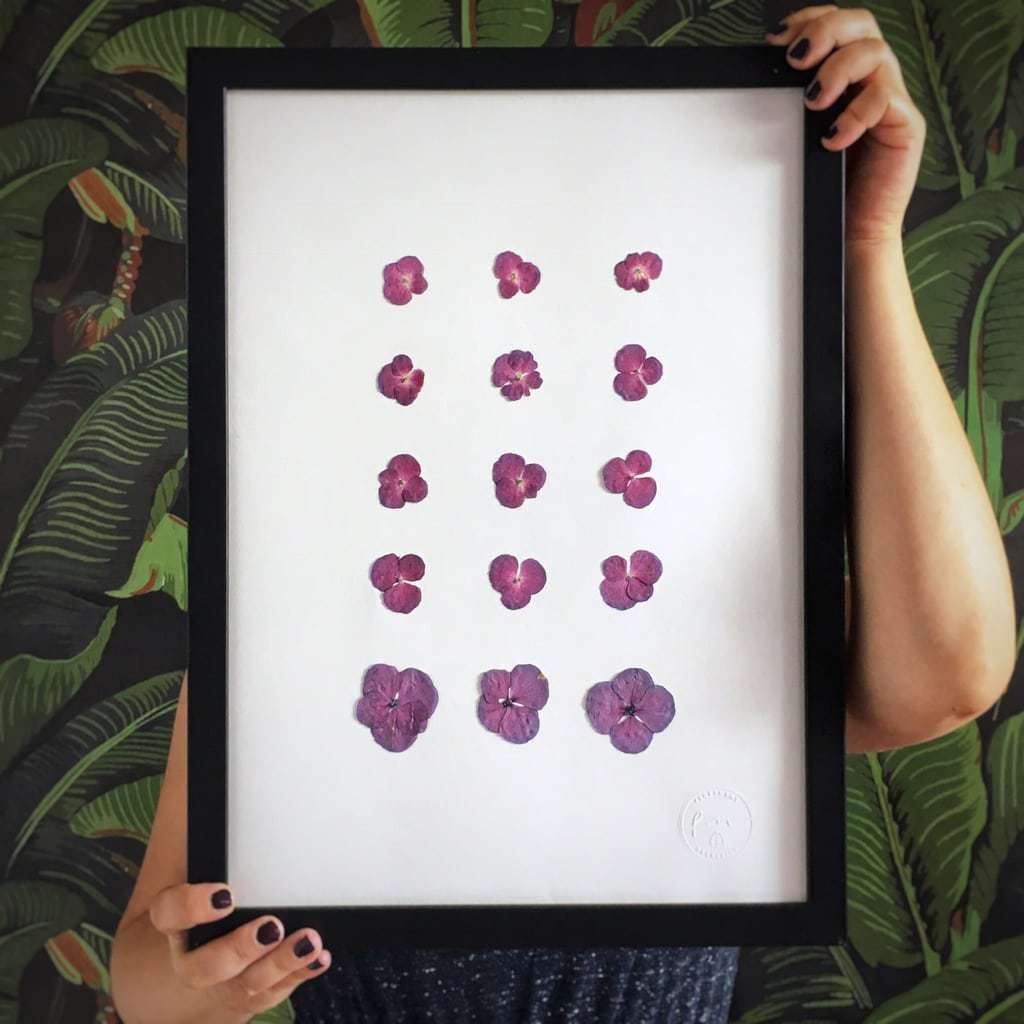 15 lilafarbene Blüten der Hortensie verewigt in einem stylischen Herbarium