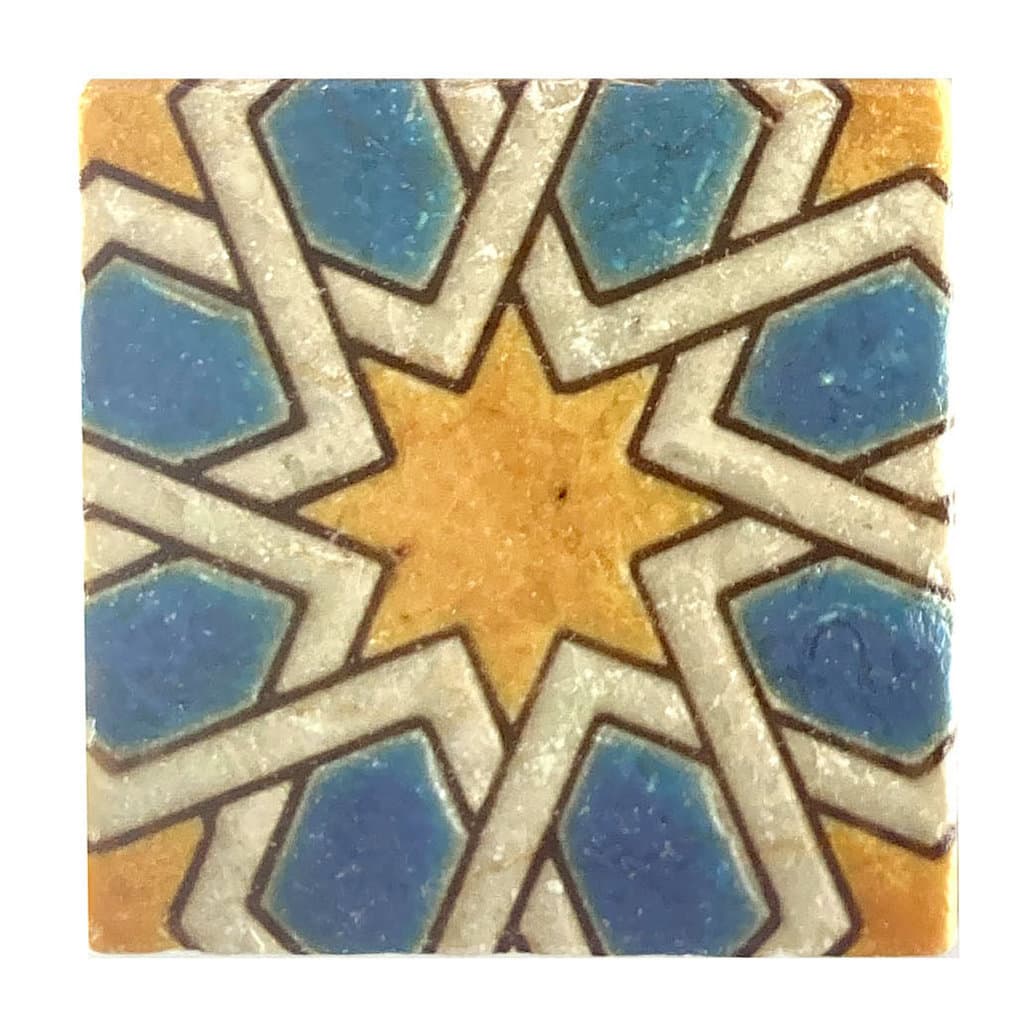 Das Motiv aus Spanien / Marokko / Andalusien geht eine schöne Verbindung mit dem rustikalen Material ein, das antike Design der Fliese ist ein echter Hingucker.
