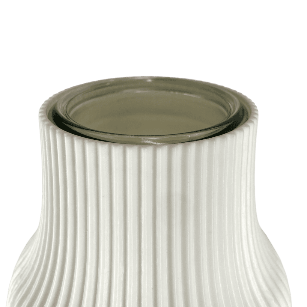 Die Vase wird im 3D-Druckverfahren aus pflanzenbasiertem Kunststoff gefertigt. Das Material überzeugt durch Stabilität, Langlebigkeit und eine angenehm matte Oberfläche. Die feine Linienstruktur verleiht der Vase ihre charakteristische, moderne Optik. Innen befindet sich ein hochwertiges Glas. So ist Gitte nicht nur für Trockenpflanzen sondern auch für frische Blumen geeignet.